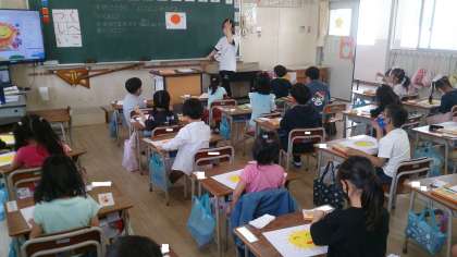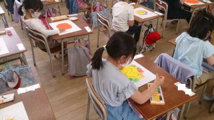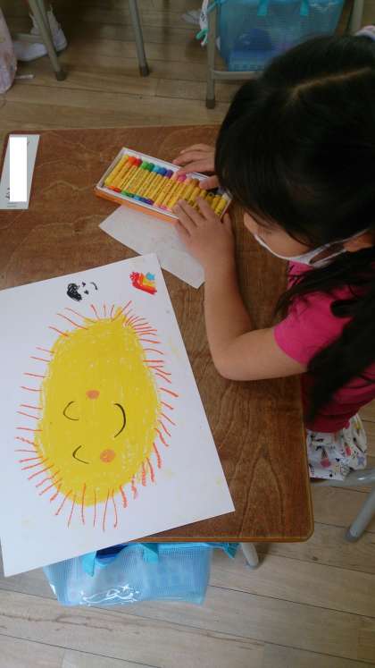 「にこにこおひさま」の絵を描きました。クレパスで大きなおひさまを描画しています。
