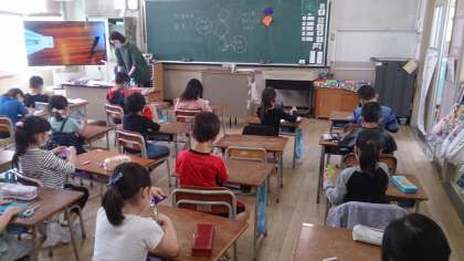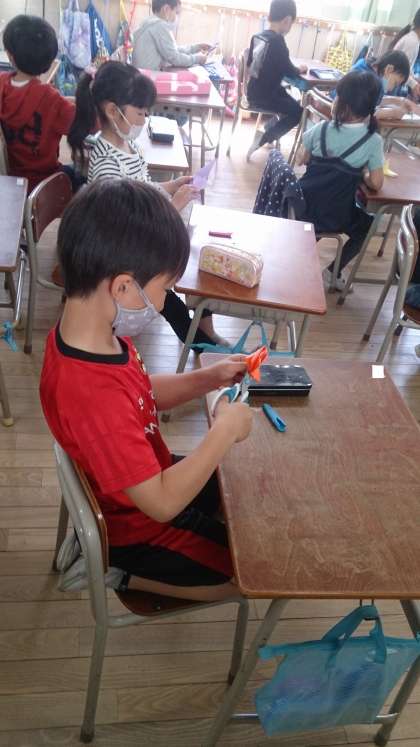 折り紙を使って飾りを作りました。重ねた折り紙をハサミできっています。どんな模様になるか楽しみですね。