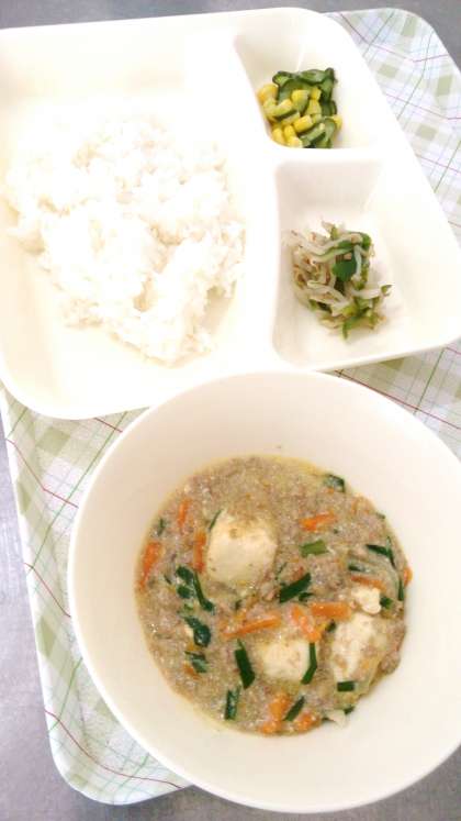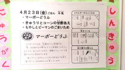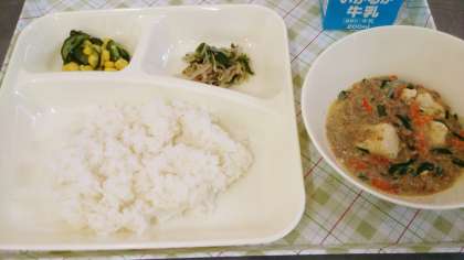 今日の給食は、マーボーどうふ、きゅうりとコーンの甘酢あえ、もやしとピーマンのごまいため、ごはん、牛乳です。