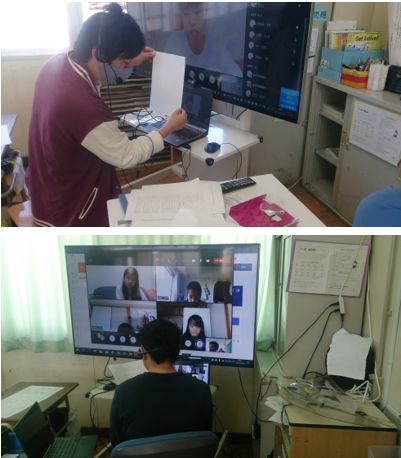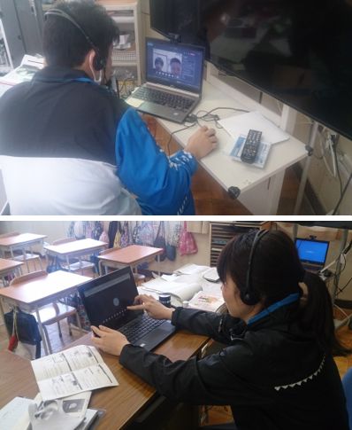 各学年では、短時間ですが、算数や社会の学習なども行われました。写真は、5・6年生の双方向通信の様子です。