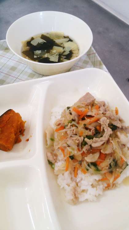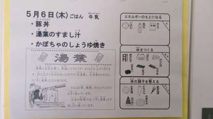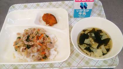今日の給食は、豚丼、湯葉のすまし汁、かぼちゃのしょうゆ焼き、牛乳です。