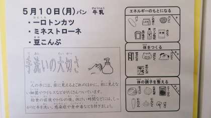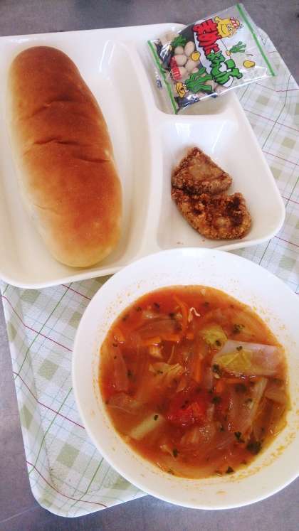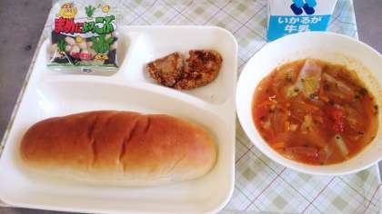今日の給食は、一口トンカツ、ミネストローネ、豆こんぶ、パン、牛乳です。
