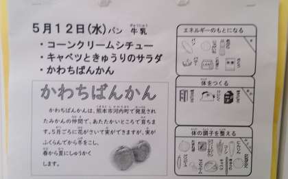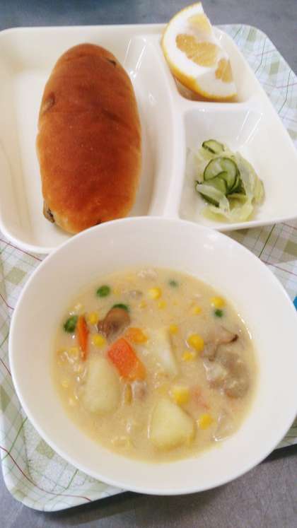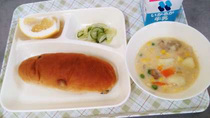 今日の給食は、コーンクリームシチュー、キャベツときゅうりのサラダ、かわちばんかん、パン、牛乳です。