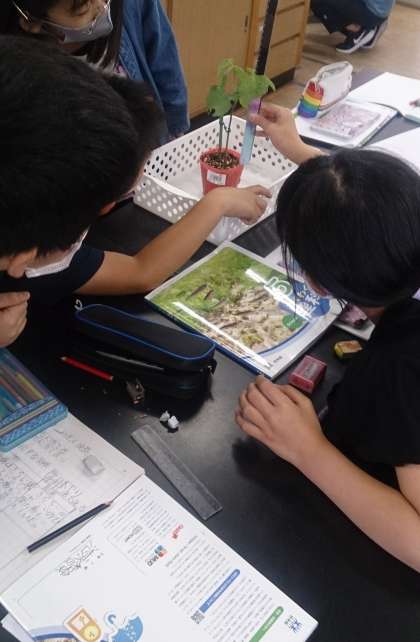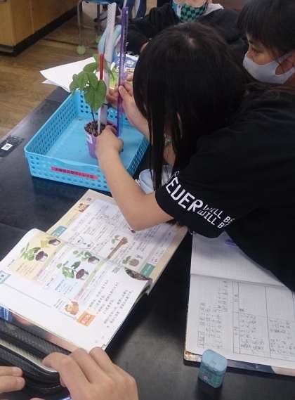 植物の発芽と成長について学習しました。子葉が取れた植物が、さらに成長するにはどんな条件が必要か、予想を立てて観察しています。