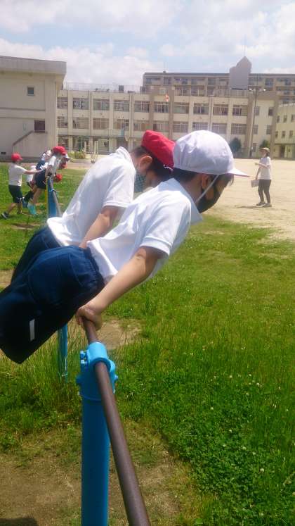 鉄棒運動に取り組みました。ぶら下がる、振る、上がるなど、いろいろな動きにチャレンジしています。