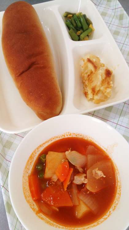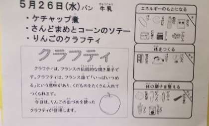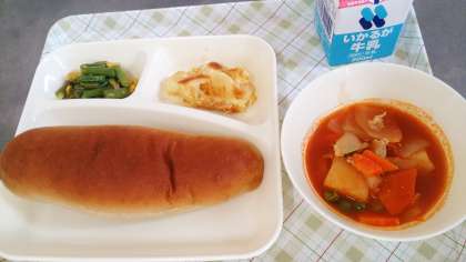 今日の給食は、ケチャップ煮、さんどまめとコーンのソテー、りんごのクラフティ、パン、牛乳です。