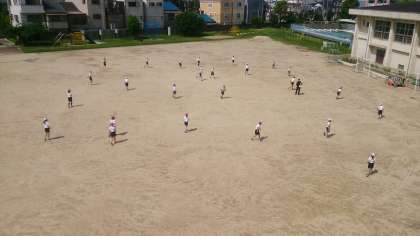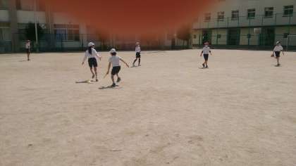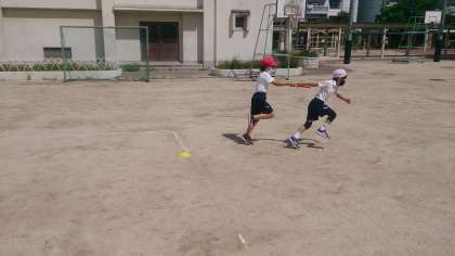 リレーでバトンパスの練習をしました。チームで協力して、バトンを渡す時の距離などを工夫しながら運動しています。