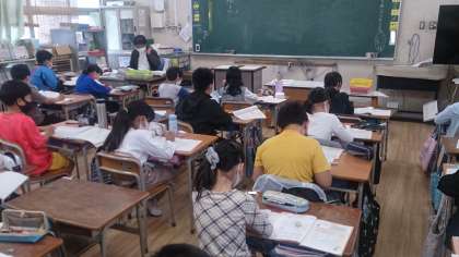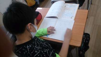 ひっ算の練習問題に取り組んでいます。商が3けたになる、3けた÷1けたのひっ算など、教科書やプリントの問題を解いています。