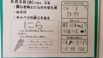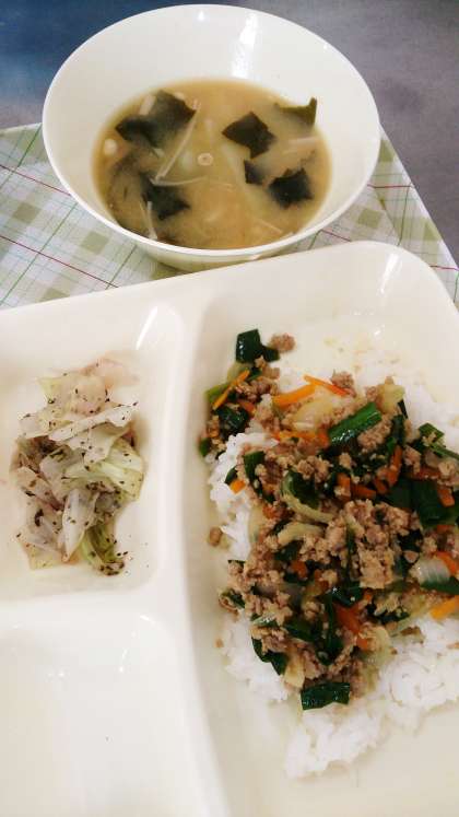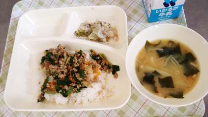 今日の給食は、豚ひき肉とにらのそぼろ丼、みそ汁、キャベツの赤じそあえ、牛乳です。