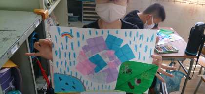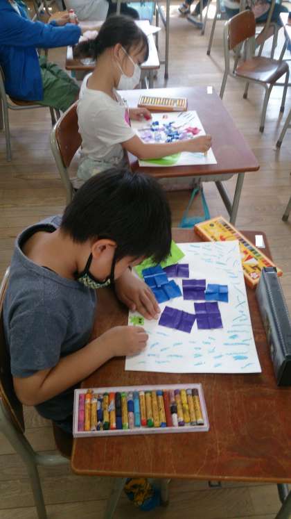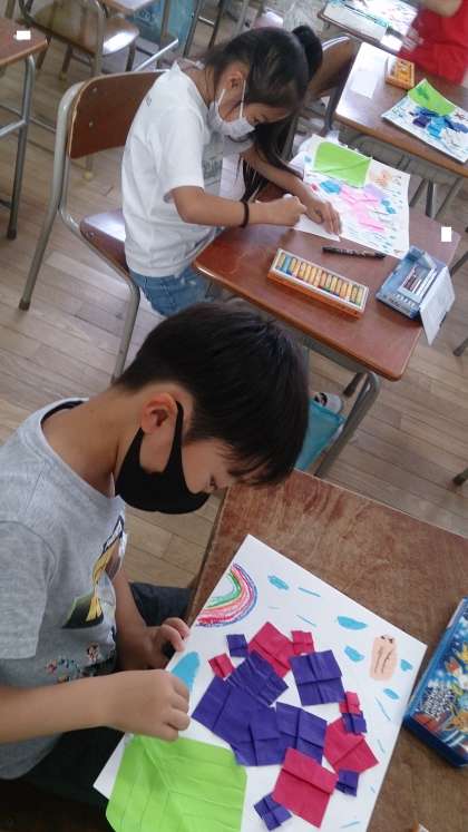 虹やあじさいをテーマにちぎり絵の造形活動に取り組みました。小さくちぎったり、重ねたりしながら工夫して作品を仕上げました。