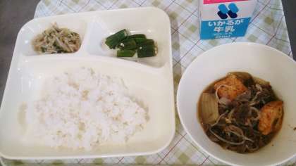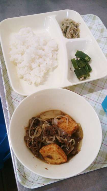 今日の給食は、すき焼き煮、オクラのかつお梅風味、もやしとピーマンのごまいため、ごはん、牛乳です。