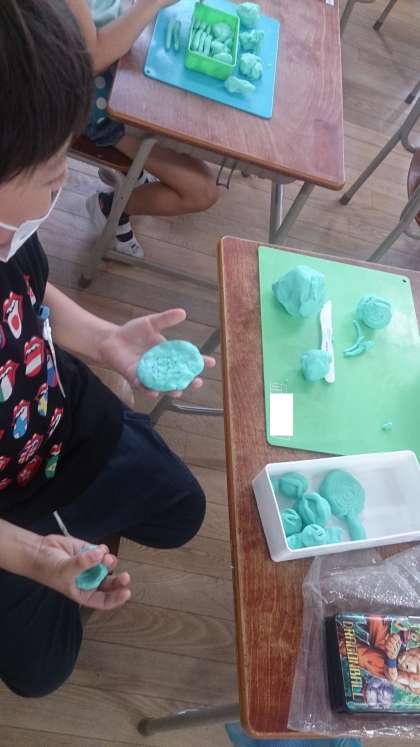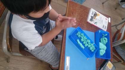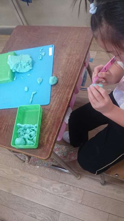 プチトマトやハンバーグ、フライドポテトなど、お弁当の中身がとてもにぎやかです。子どもたちはとても楽しそうに活動しています。