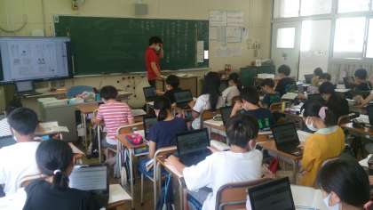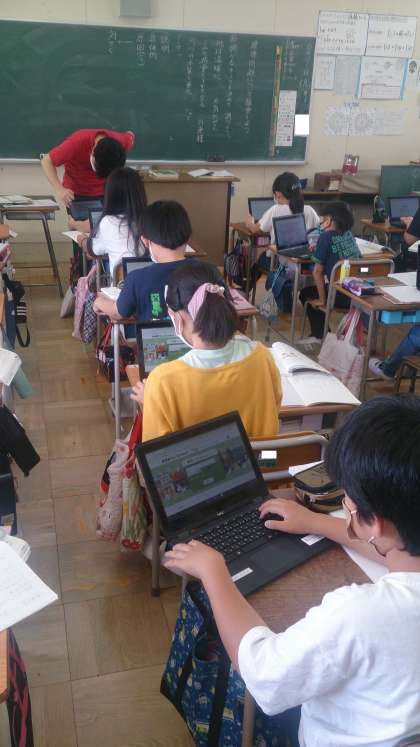 「環境問題を報告しよう」の学習に取り組んでいます。一人一台端末PCを使って、環境問題についてインターネットで調べています。