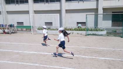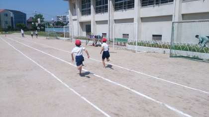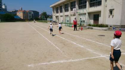 暑い中ですが、水分補給や休憩をとりながら、子どもたちは50m走に全力で取り組んでいます。