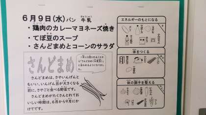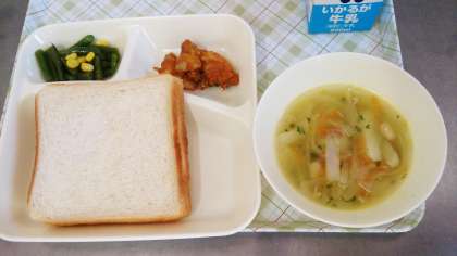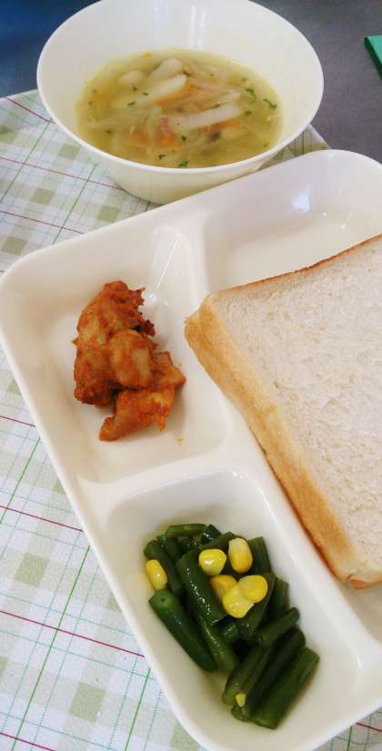 今日の給食は、鶏肉のカレーマヨネーズ焼き、てぼ豆のスープ、さんどまめとコーンサラダ、パン、牛乳です。