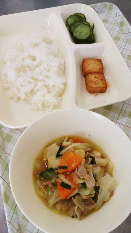 今日の給食は、中華煮、あつあげのビリ辛じょうゆかけ、きゅうりの中華あえ、ごはん、牛乳です。