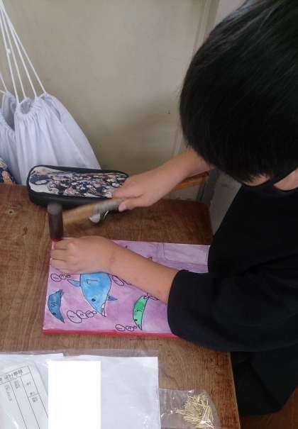 「くぎうちビー玉ゲーム」の作品づくりをしました。くぎうちやゲーム盤の彩色の仕上げに取り組んでいます。