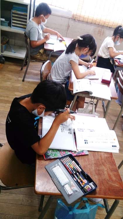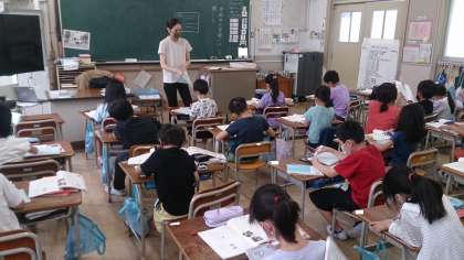 「外国の小学校について聞こう」の学習をしました。ミニボードに、日本と外国の小学校の同じところや違うところを書いて発表します。
