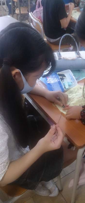 裁縫に取り組んでいます。「玉結び」「玉止め」の基本を学んでいます。