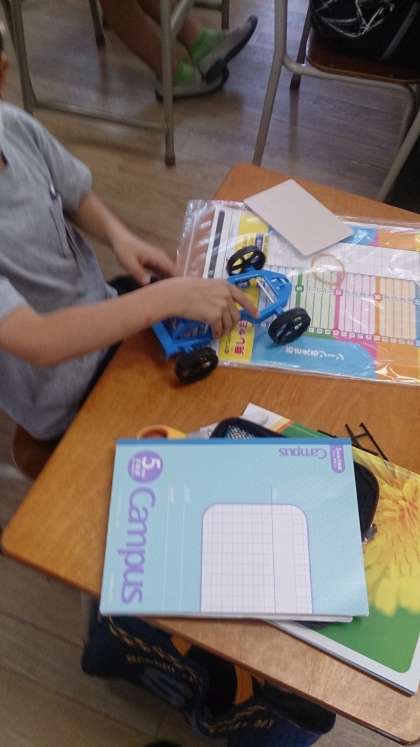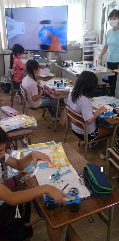 風の働きについて学習しました。風で動く車を使って、風の強さによって物を動かす働きが変わることを学んでいきます。写真は、車を組み立てている様子です。