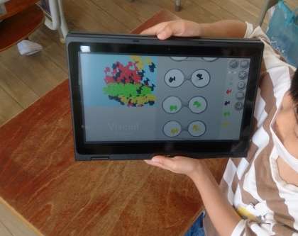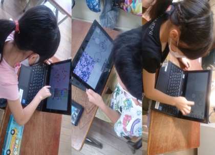 プログラミング学習をしました。ビジュアルプログラミング言語ビスケットを使って、自分で描画した絵を素材として、いろいろな動きをする作品作りに取り組みました。