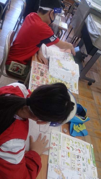 食品の産地について学習しました。スーパーマーケットのチラシから、農産物、水産物、畜産物がどこの産地かを友だちと協力して調べています。