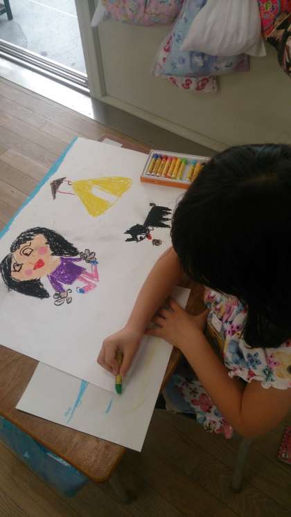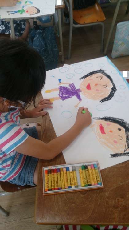 自分の登場する絵を描きました。お友だちや家族の人たちも描画しています。楽しそうな様子が表現されています。