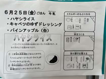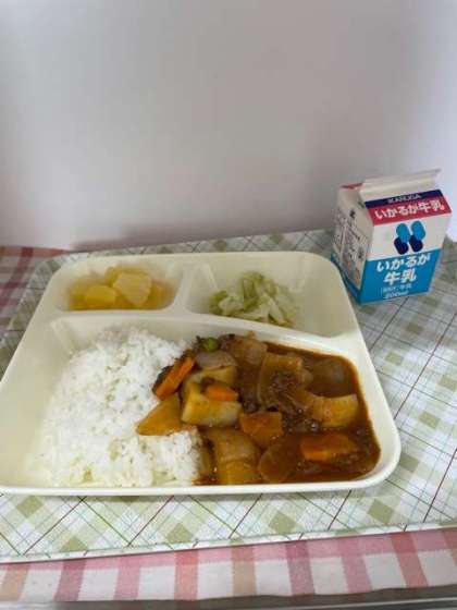 今日の給食は、ハヤシライス、キャベツのゆずドレッシング、パインアップル缶、牛乳です。