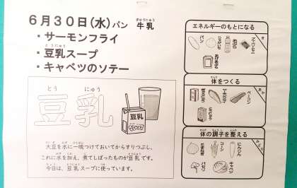 今日の給食は、サーモンフライ、豆乳スープ、キャベツのソテー、パン、牛乳です。