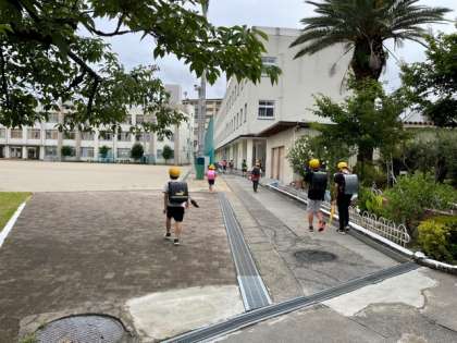 雨があがり、、気持ちの良い朝の子どもたちの登校の様子です。校長先生や管理作業員さん、他の先生方との気持ちのよいあいさつができていました。今日は、プールに入る学年が多いのでプールの用意を持っている児童がいました。