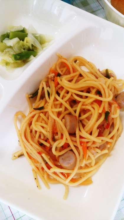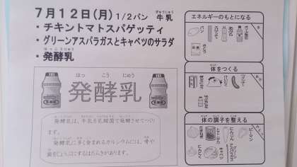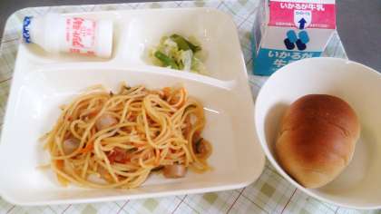 今日の給食は、チキントマトスパゲッティ、グリーンアスパラガスとキャベツのサラダ、発酵乳、パン、牛乳です。