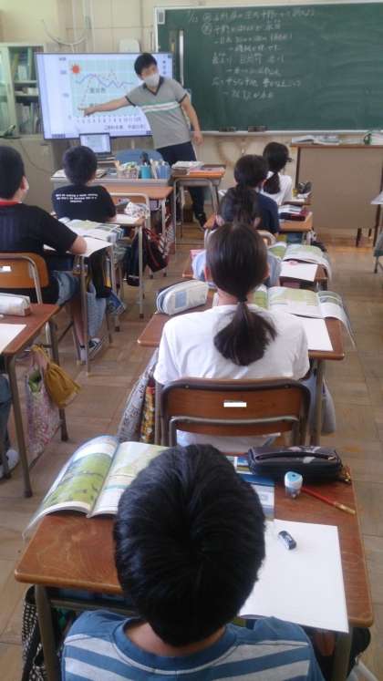 山形県の庄内平野について学習しました。土地の利用や降水量など、米づくりのさかんな地域について資料を活用して調べています。