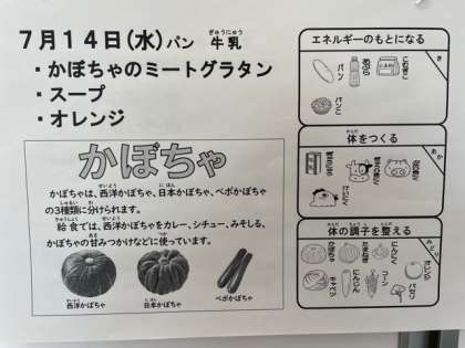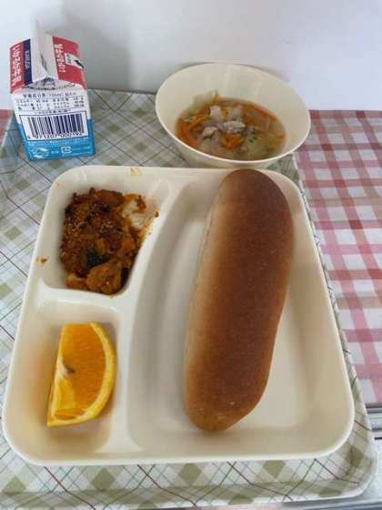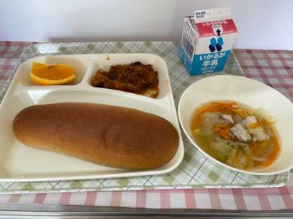 今日の給食は、かぼちゃのミートグラタン、スープ、オレンジ、パン、牛乳です。