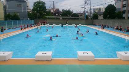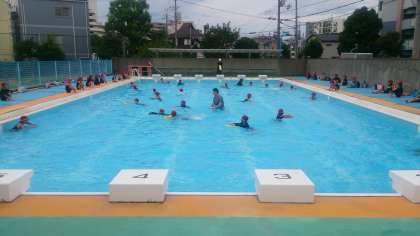 ビート板を使って、水の中を移動する運動遊びに取り組みました。子どもたちは、とても楽しそうでした。