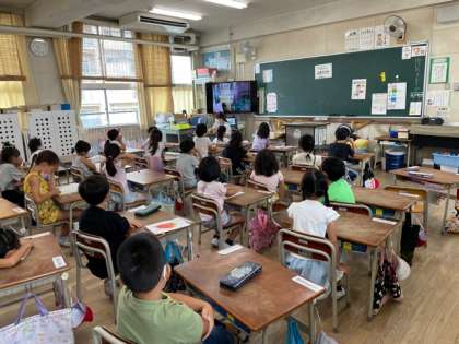 1年生は、大型テレビの画面で絵本のよみきかせで真剣にお話をきいていました。