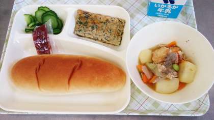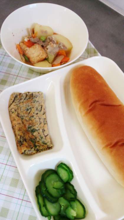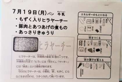 今日は、1学期の給食終了の日です。今日の給食は、もずく入りヒラヤーチー、豚肉とあつあげの煮もの、あっさりきゅうり、パン、牛乳です。