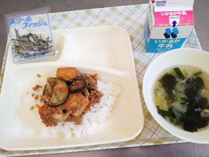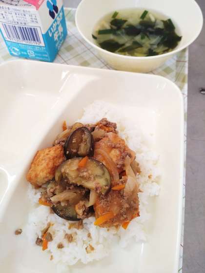 今日の給食は、マーボーあつあげ丼、中華スープ、ミニフィッシュ、ごはん、牛乳です。