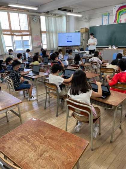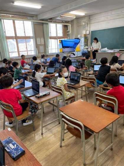2年生がタブレットを使ってデジタルドリルの学習の準備をしています。