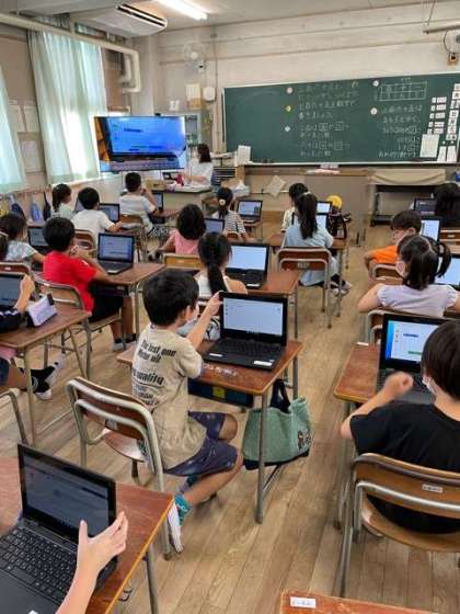2年生は、タブレットでオンラインの学習ができるように練習をしました。タブレットで学習を自分でできるように練習しました。問題が解けると採点もしてくれて、トロフィーがもらえます。ゲーム感覚で学習ができるようになっています。