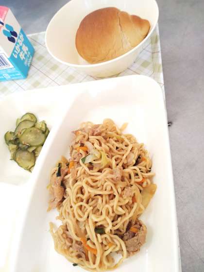 今日の給食は、オイスターソース焼きそば、きゅうりの中華あえ、パン、牛乳です。