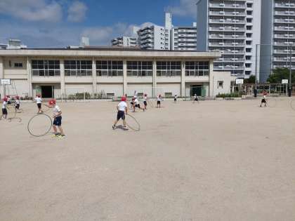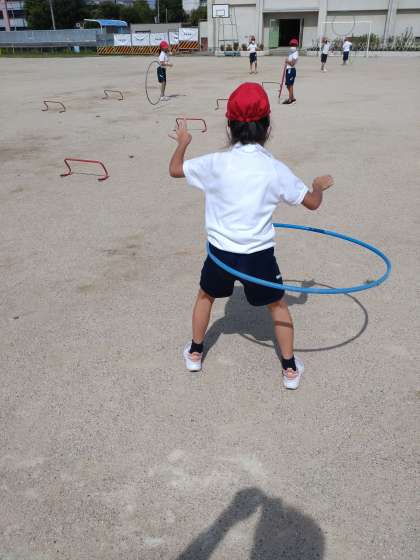 用具を操作する運動遊びをしました。輪が落ちないように回したり、転がしたりしています。