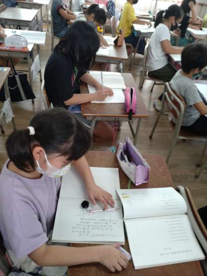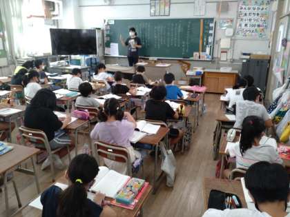 3年生は、「夕日でせなかをおしてくる」の詩の学習をしました。読み方をどんなふうにしたらいいのか話し合いました。視写もたいへん丁寧に取り組んでいます。