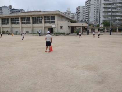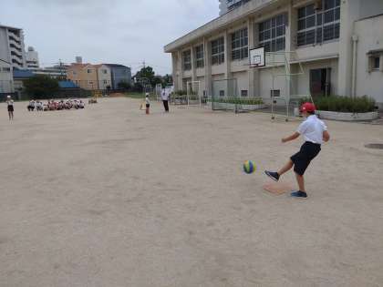ベースボール型ゲームに取り組みました。蹴る、捕る、投げるなどの動きを通して、ゲームを楽しんでいます。