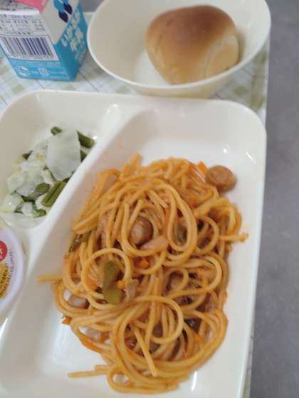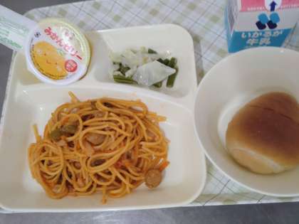 今日の給食は、イタリアンスパゲッティ、グリーンアスパラガスとキャベツのサラダ、みかんゼリー、パン、牛乳です。