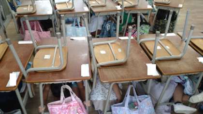 大阪880万人訓練が、大雨警報のため中止になりました。そこで、学校独自に地震の避難訓練を行いました。昼休み中の訓練でしたが、子どもたちは、しっかりと避難行動をとることができました。写真は、1年生の避難の様子です。