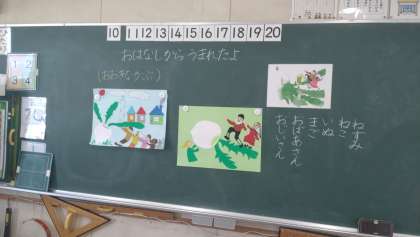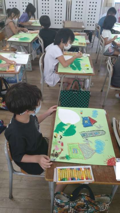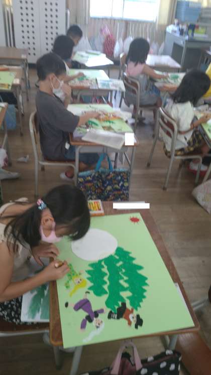 「おはなしからうまれたよ」の描画に取り組んでいます。物語文「大きなかぶ」から、登場人物や背景を描いています。