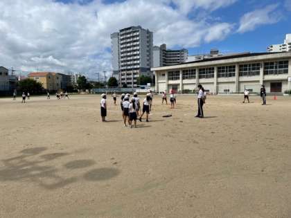 3年生は、体育で「ラケットベースボール」をしました。守備のチームは、ボールを取ってみんなで集まり、座るまでに相手チームの走者がベースにたどり着かないとアウトになります。子どもたちは、協力して活動していました。教育実習生も見学に来ていました。