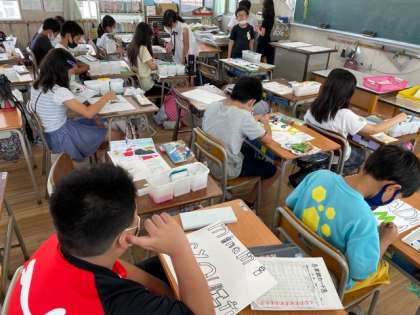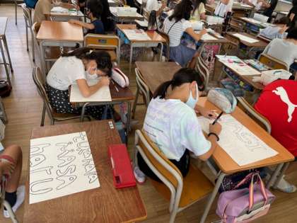 4年生は、図画工作で、自分の名前をローマ字でデザインしたものに色を塗りました。