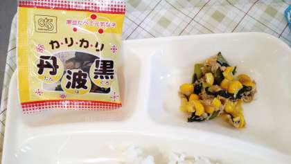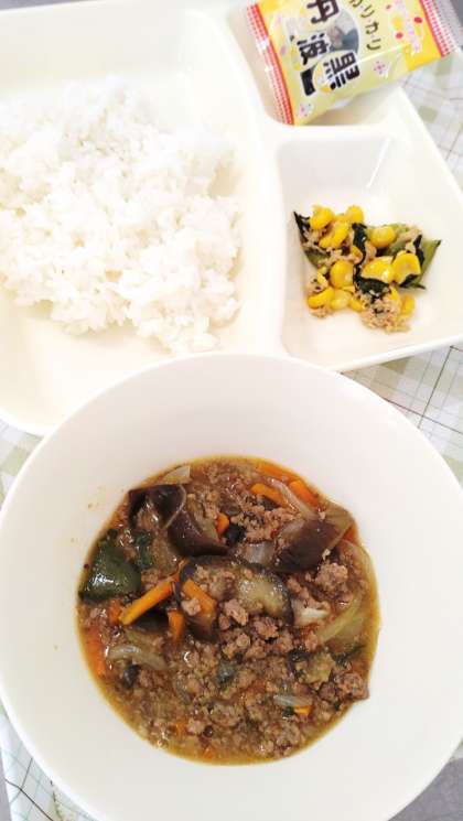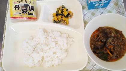 今日の給食は、マーボーなす、ツナとチンゲンサイのいためもの、いり黒豆、ごはん、牛乳です。