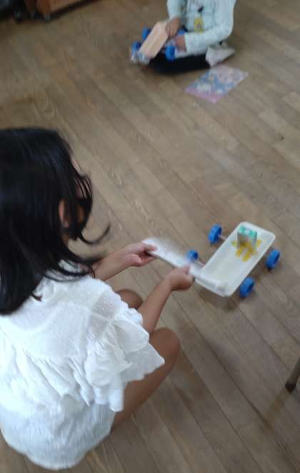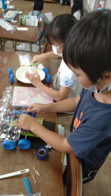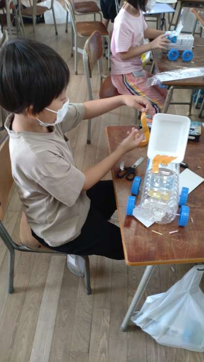 「風で動く車」の作品づくりに取り組んでいます。ペットボトル・卵パック・紙皿などのいろいろな材料を工夫して作っています。